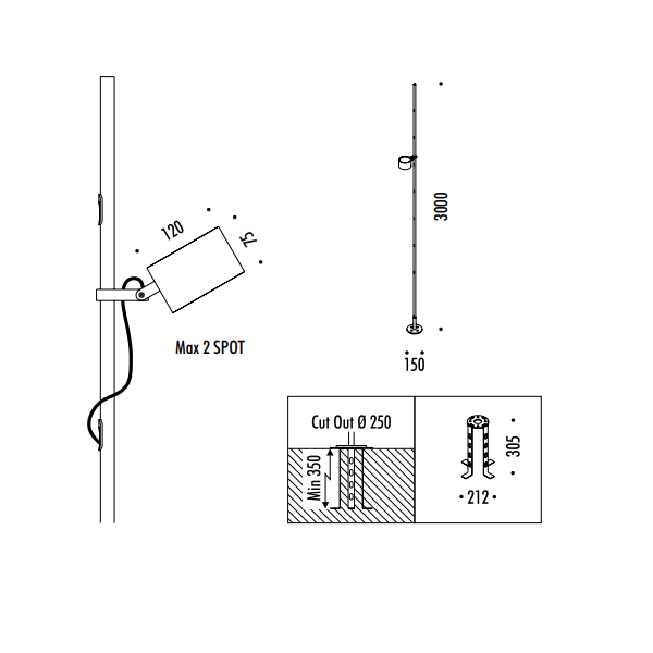 Tirafondo installazione: Cut-out Ø 250 mm – Minimum space for mounting 350 mm