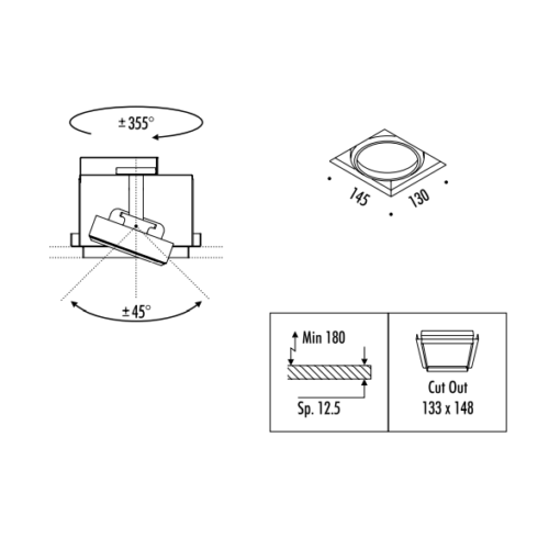 Dimensioni: Spazio minimo per incasso 180mm – Dimensioni taglio cartongesso 133x148mm