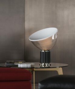 Lampada da terra, a luce diffusa; un pulsante posto in prossimità del diffusore consente, tramite un dimmer “remoto” posizionato sul cavo elettrico in prossimità della spina e la regolazione dell’intensità luminosa su quattro livelli. Base e supporto asta in lega di Zama pressofusa lucidata e cromata.