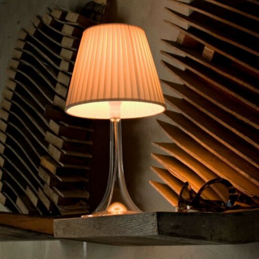 Apparecchio di illuminazione da tavolo a luce diffusa. Corpo in PMMA (polimetilmetacrilato) completamente trasparente stampato ad iniezione; diffusore interno in PC (policarbonato) opalino stampato ad iniezione e diffusore esterno in PC (policarbonato) trasparente o colorato stampato ad iniezione alluminato – sulla superficie intera – con processo di alluminatura sottovuoto all’interno.