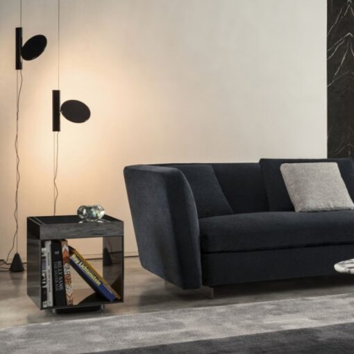 Apparecchio di illuminazione a luce diretta. Testa in alluminio pressofuso verniciato lucido o cromato. Corpo in PA66+30%FV stampato ad iniezione con cover in alluminio estruso verniciato lucido o cromato. Testa orientabile. Il movimento verticale del corpo illuminante è ottenuto mediante lo scorrimento della struttura interna del corpo su un cavetto di acciaio teso tra il plafone e il pavimento. Interruttore dimmerabile con tecnologia Soft Touch. Alimentatore su spina con plug intercambiabili.