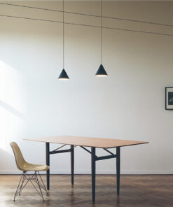 Lampada a sospensione a luce diffusa. Corpo in alluminio pressofuso verniciato in nero, bianco o blu, rivestito con vernice soft-touch trasparente. Diffusore ottico in PC opalino. Sistema di sospensione di 12 metri con cavo coassiale rinforzato in Kevlar. Disponibile con attacco a parete/soffitto in PC nero e alimentatore con interruttore a pavimento in PC verniciato nero. Interruttore on/off elettronico con dimmer ottico e a sfioramento incluso o dimmer a sfioramento e versione predisposta per CASAMBI. Dimmer incluso. Indispensabile aggiungere un interruttore a pavimento o un rosone a soffitto/parete.
