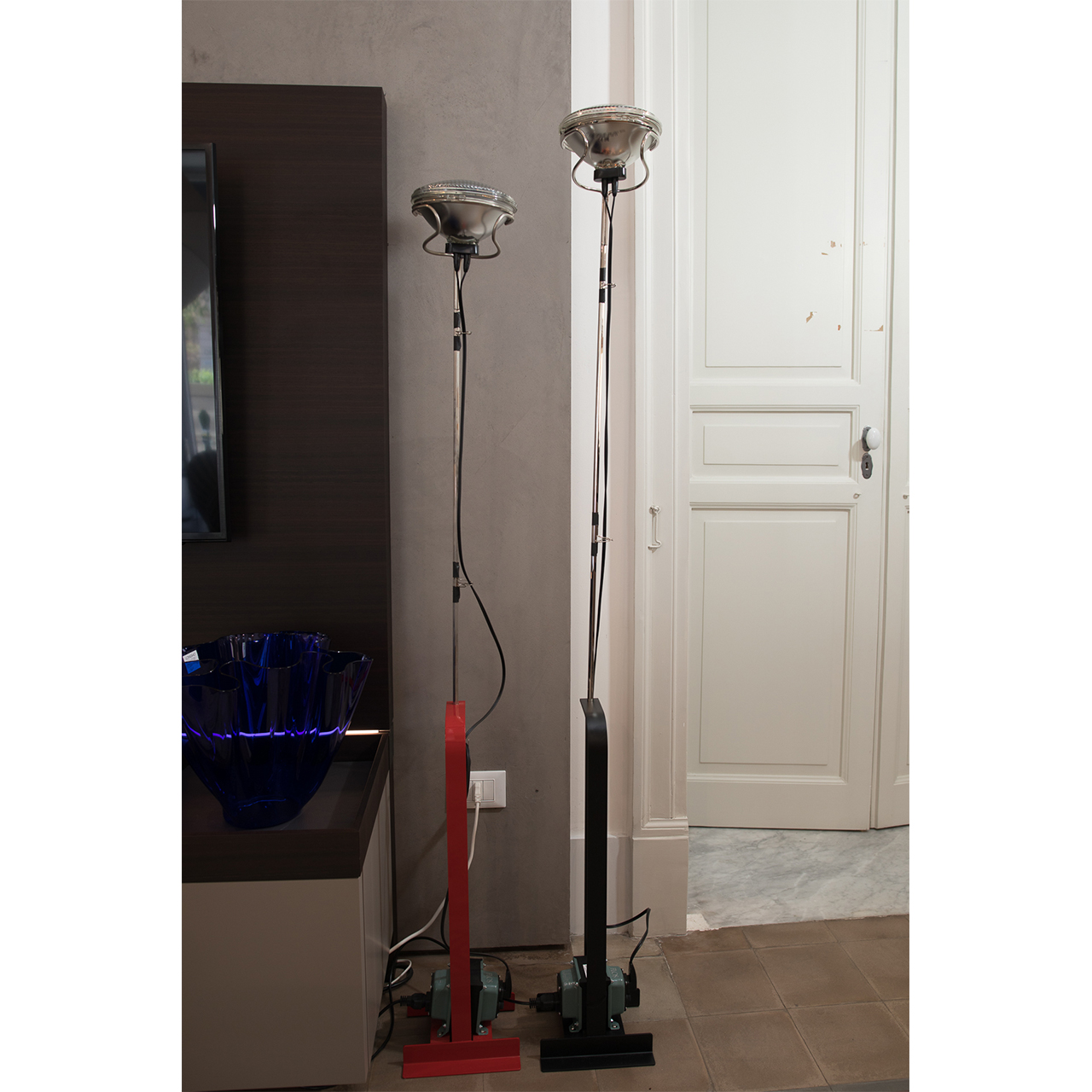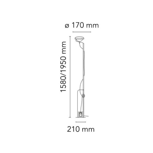 Apparecchio di illuminazione da terra a luce indiretta. Base di acciaio tranciato e piegato e struttura in profilati d’acciaio, entrambi verniciati a liquido, nei vari colori. Stelo con sezione esagonale in ottone nichelato. Il movimento telescopico dell’asta consente la regolazione dell’altezza dell’apparecchio. Sul cavo è presente il dimmer elettronico che consente la regolazione a step dell’intensità luminosa.