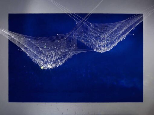 Lacrime del Pescatore di Ingo Maurer è un oggetto luminoso composto da tre reti in nylon con cristalli in vetro. Se installata in una posizione strategica, Lacrime del Pescatore brilla anche di giorno alla luce del sole. Unendo più esemplari alla volta è possibile creare con un dispendio relativo un oggetto luminoso poetico e molto suggestivo. Lacrime del Pescatore è un omaggio al villaggio di pescatori sul lago di Costanza dove Ingo Maurer è cresciuto: questo poetico oggetto luminoso ricorda una rete da pesca che viene appena tirata fuori dall’acqua e in cui le pentole d’acqua sono ancora appese, scintillando al sole.