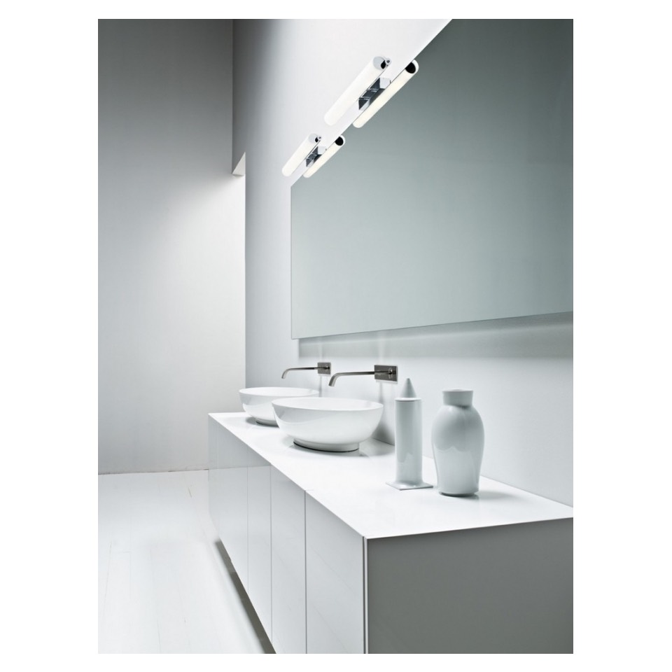 Famiglia di applique, LED e alogene, a luce diffusa, caratterizzate da un tubo diffusore in Pyrex sabbiato o in metacrilato opalino (LED) montato su una struttura in alluminio spazzolato lucido.